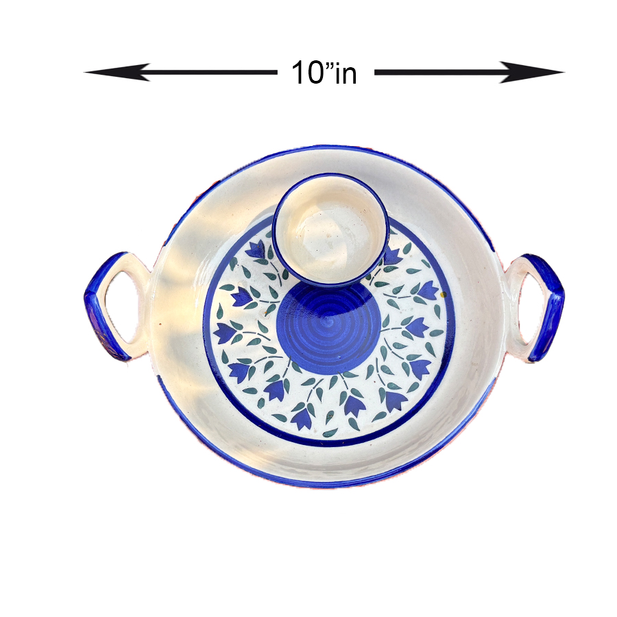 Stylish 10-inch ceramic serving plate with side handles and one attached cup, featuring a classic hand-painted blue floral pattern. Perfect for serving snacks with dips or chutneys.