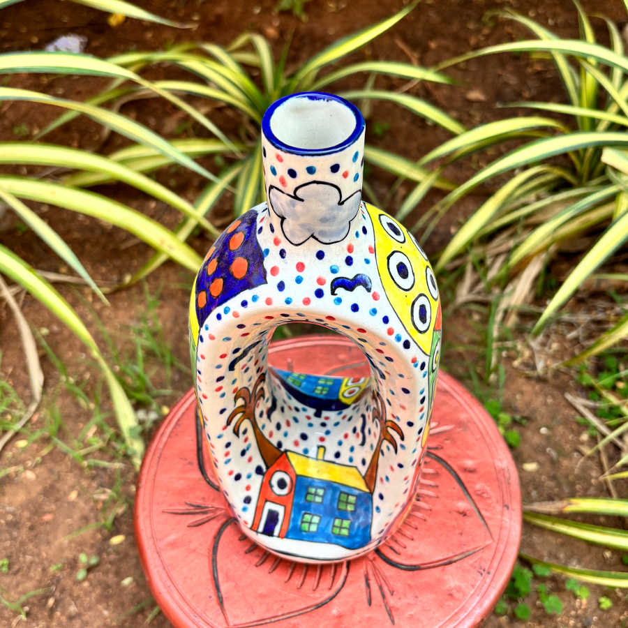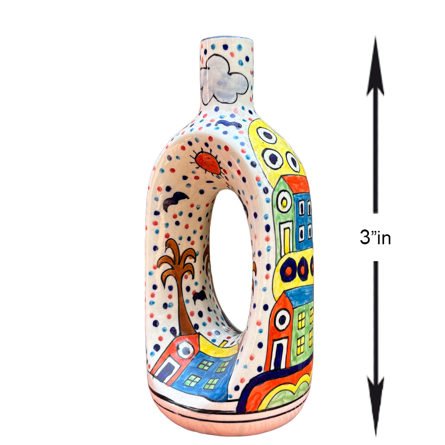 Bring creativity and color into your living space with this stunning 11-inch hand-painted ceramic flower vase. Designed with a distinctive open-center silhouette, this artistic piece doubles as both a functional vase and a decorative statement accent.