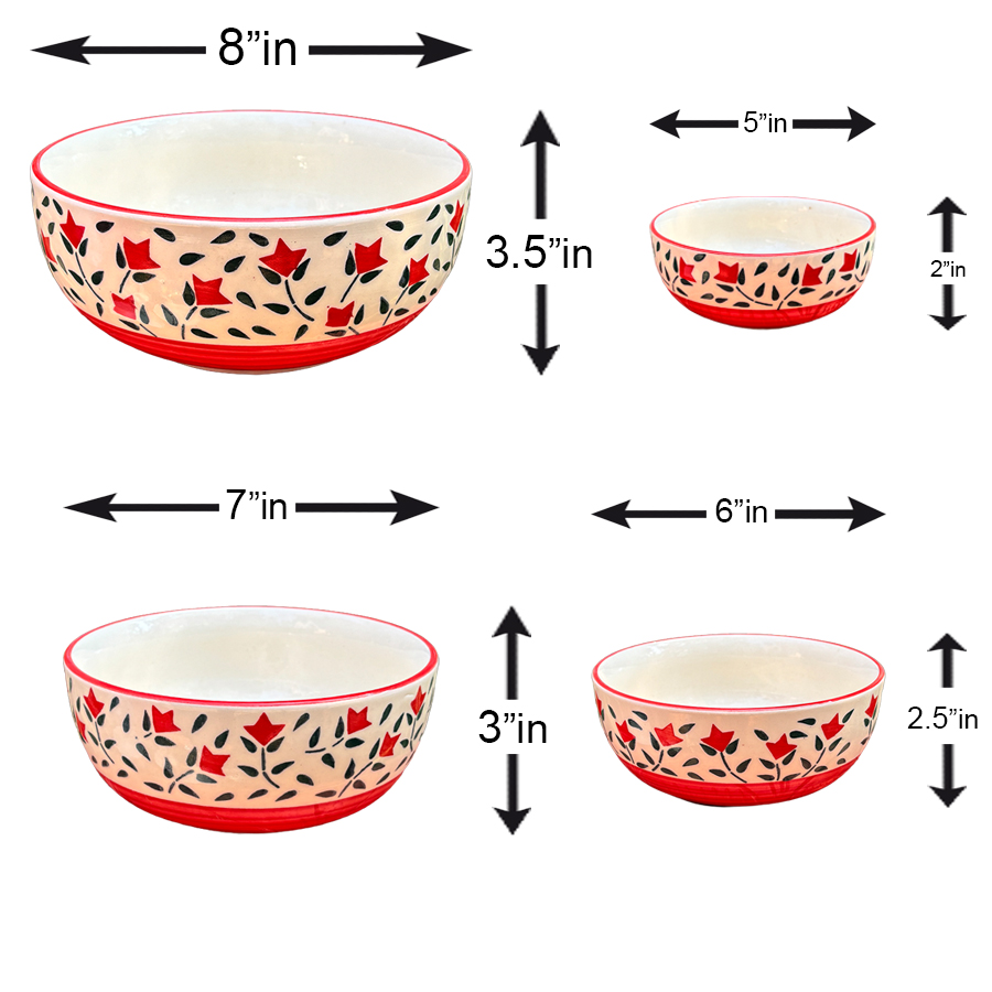 Enhance your kitchen and dining experience with this beautifully crafted 4-piece ceramic bowl set. Designed with a charming hand-painted red floral and leaf pattern on a soft neutral base, these bowls bring warmth and style to any table setting. The bold red rim and base add a striking finishing touch.