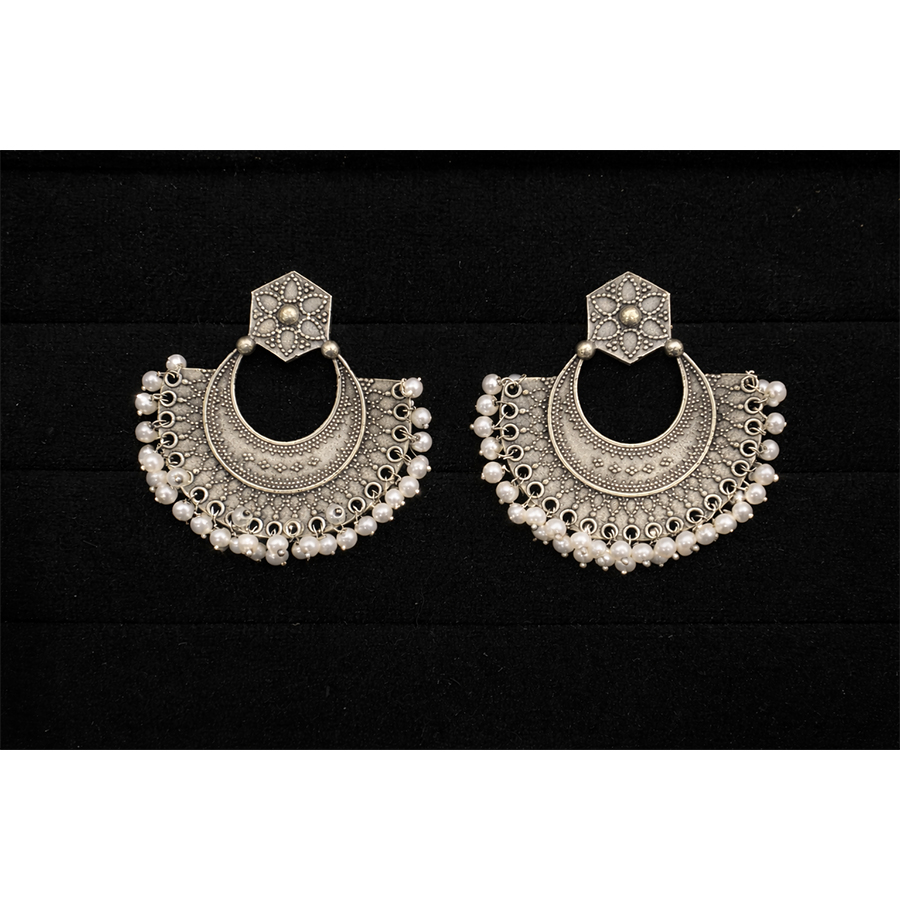 These beautifully crafted oxidized silver chandbali earrings are a perfect blend of traditional artistry and statement design. The top features a hexagonal floral stud adorned with intricate beadwork patterns, adding a subtle yet refined touch.