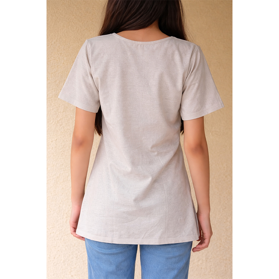 Designed with short sleeves, a straight silhouette, and a soothing beige tone, this kurti pairs effortlessly with leggings, straight pants, jeans, or palazzos. Its minimal yet elegant design makes it suitable for casual outings, office wear, festive gatherings, temple visits, and handcrafted clothing lovers.