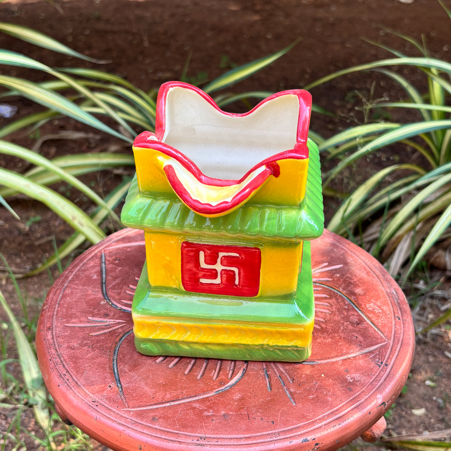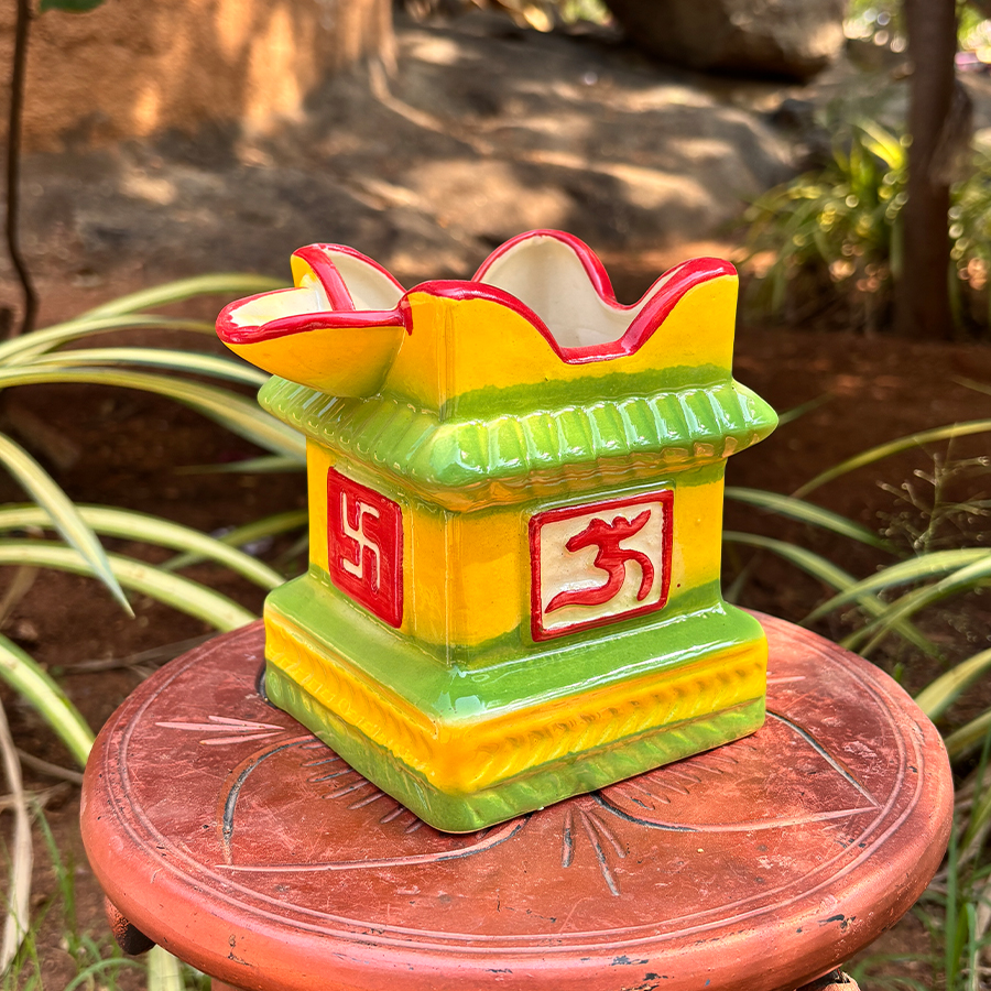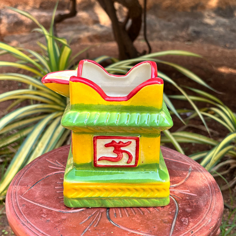 Enhance your spiritual space with this beautifully crafted Ceramic Tulasi Kota, designed in a traditional temple-style structure. Featuring bright yellow and green tones with red sacred symbols, this decorative Tulsi planter adds a devotional and cultural touch to your home.