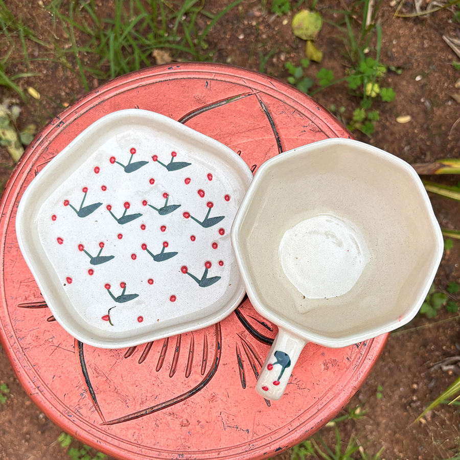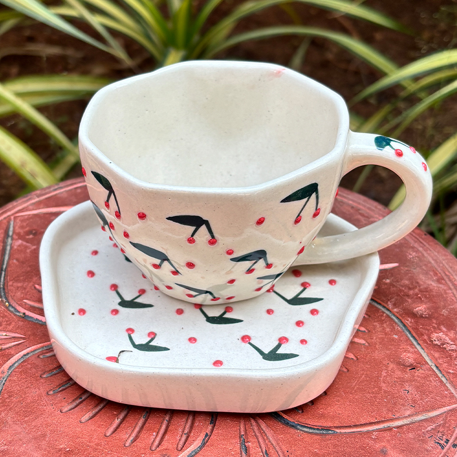 & Free Shipping| Charming hand-painted ceramic cup & saucer set featuring a playful cherry design and smooth glossy finish. Perfect for tea or coffee. Sizes: Cup Width – 3 inches | Cup Height – 3 inches | Plate – 5 inches. |
