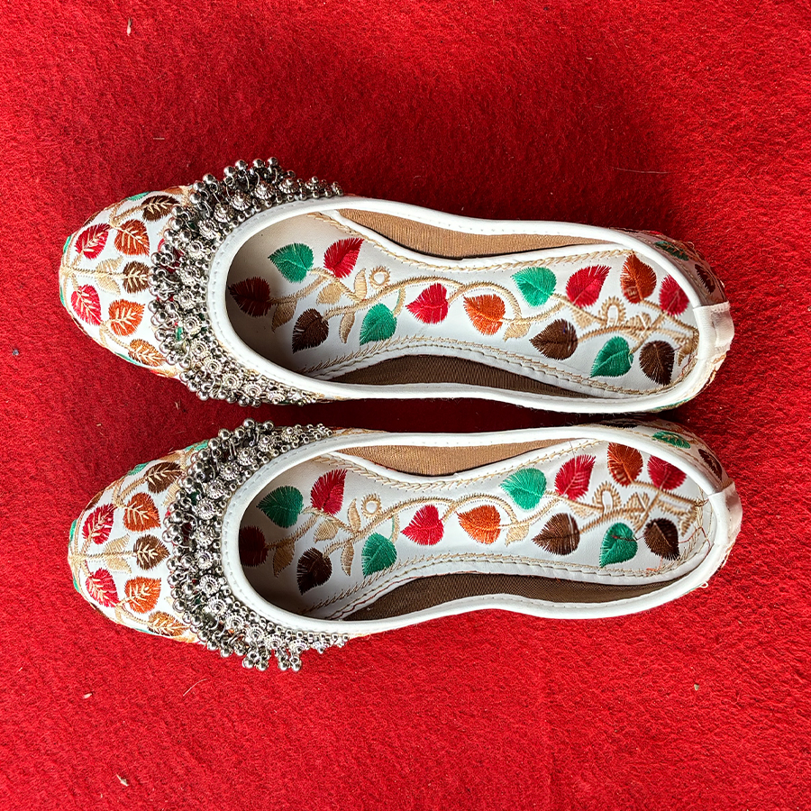 Step into timeless elegance with these beautifully crafted Payal Judi flats, designed to celebrate traditional artistry with a refined touch. Featuring delicate floral and leaf embroidery across the upper and insole, each pair is enhanced with signature Payal-inspired metallic embellishments that add texture, charm, and a festive sparkle.