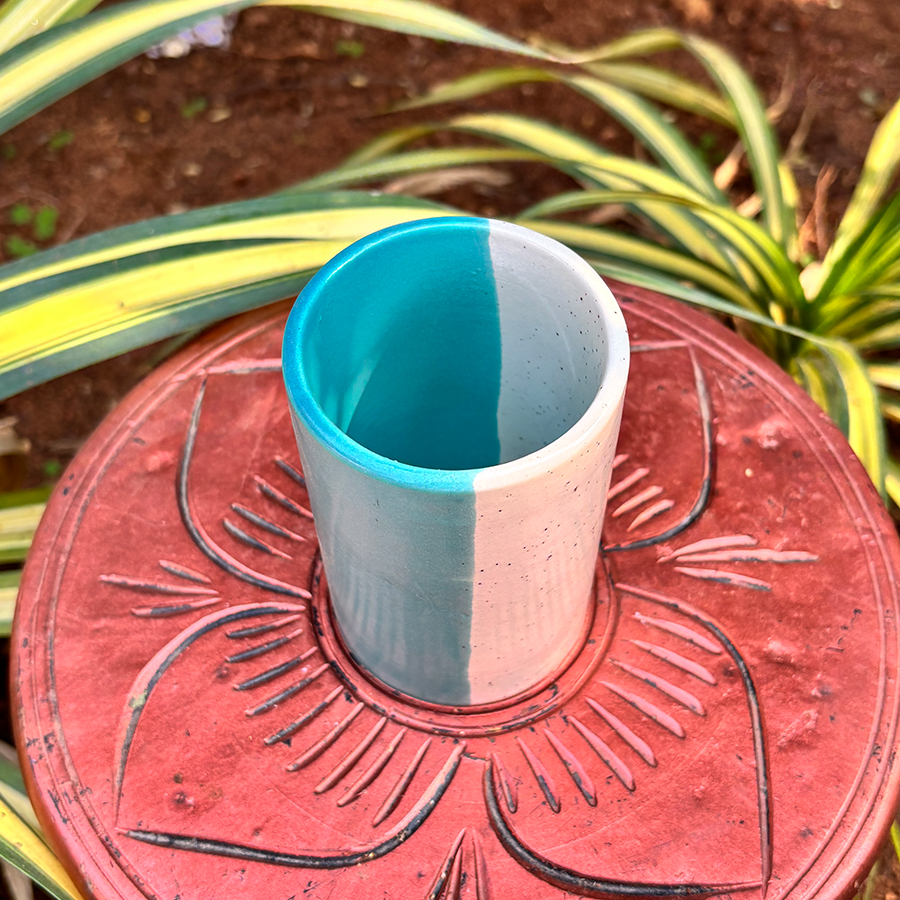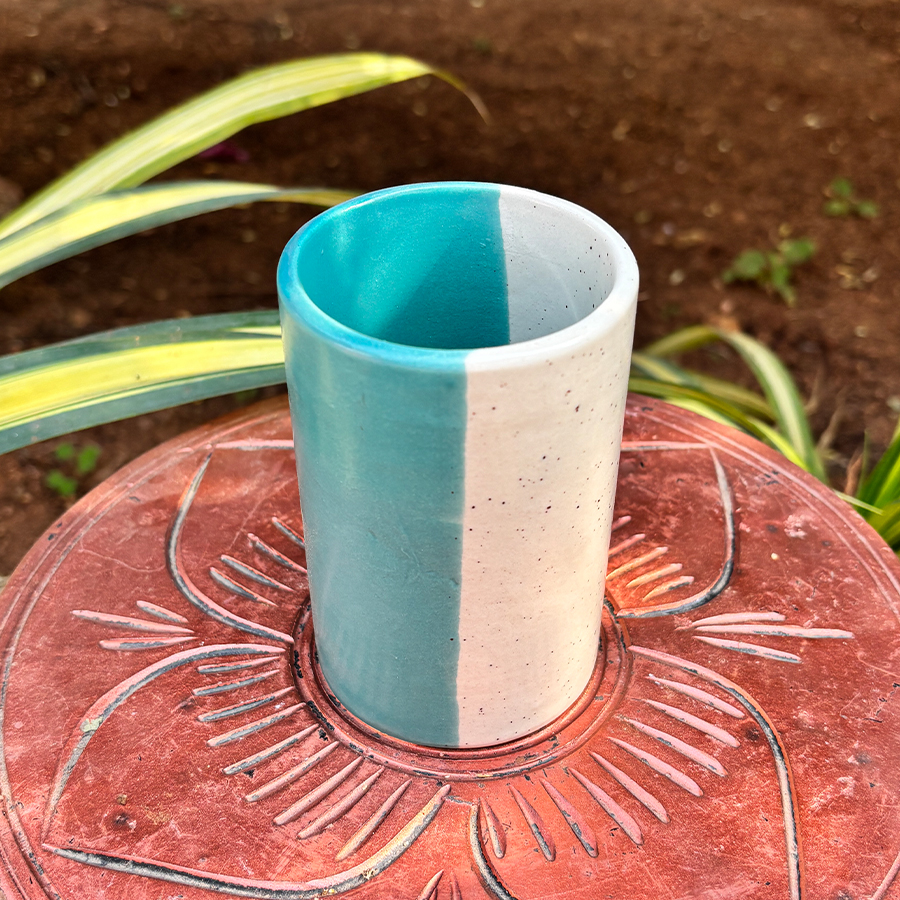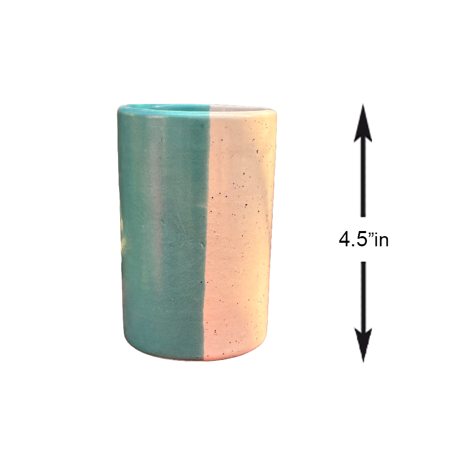 Enhance your drinkware collection with this elegant dual-tone ceramic tumbler. Standing 4.5 inches tall, this beautifully crafted cup features a soft pastel color combination with a subtle speckled texture, giving it a contemporary and handcrafted appeal.