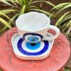 & Free Shipping| Stylish hand-painted ceramic cup & saucer set featuring a striking evil eye design with a smooth glossy finish. Perfect for tea or coffee. Sizes: Saucer – 5 inches | Cup Width – 3.5 inches | Cup Height – 3 inches. |