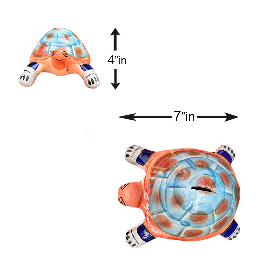 Make saving money fun with this adorable hand-painted ceramic tortoise piggy bank. Designed in a playful tortoise shape, this charming coin saver features a colorful shell with soft blue and earthy tones, along with cute facial details that bring it to life.