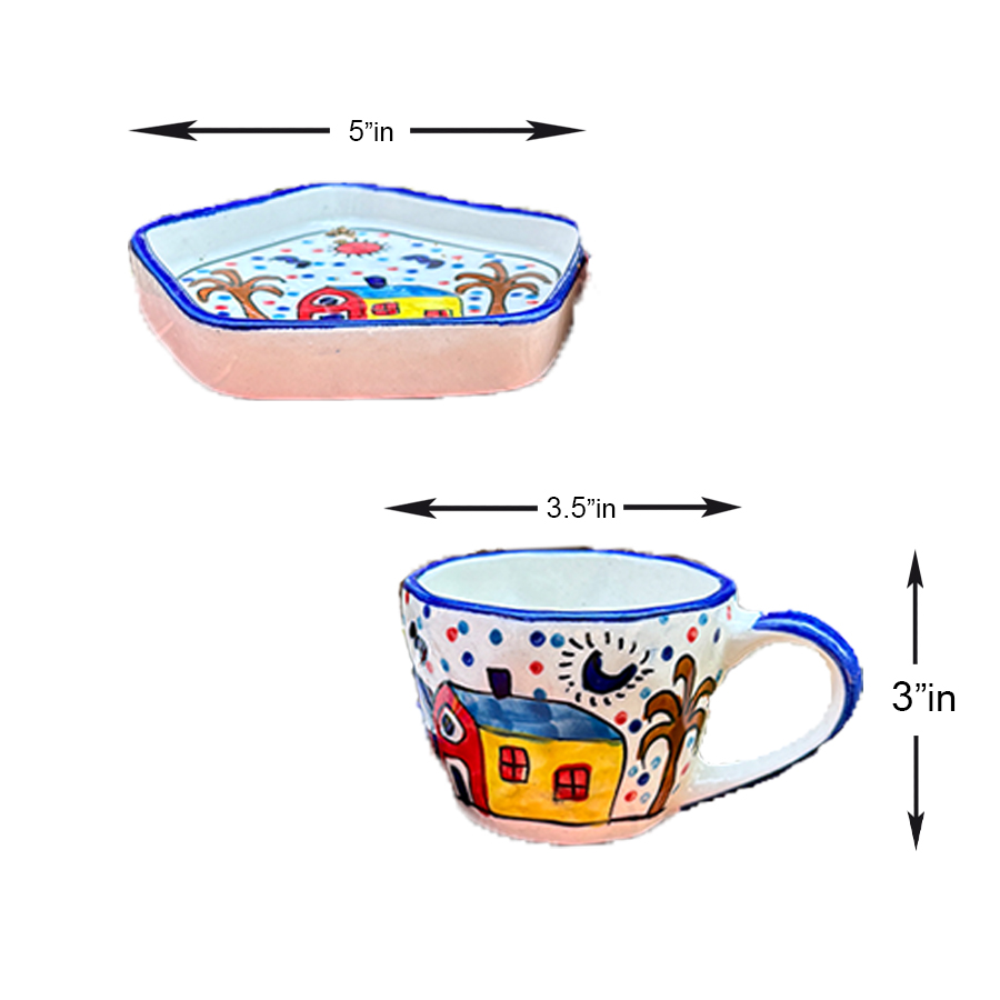 Thoughtfully designed for convenience and versatility, the set includes a stylish cup with a comfortable handle and a matching vatti (bowl), perfect for serving beverages, snacks, desserts, dry fruits, or small treats. Its compact yet practical size makes it suitable for home use, guests, or gifting purposes. Whether you are enjoying your morning tea, hosting friends, or looking for a unique gift, this ceramic set offers a perfect blend of functionality and aesthetic appeal. Product Highlights: Dimensions: |