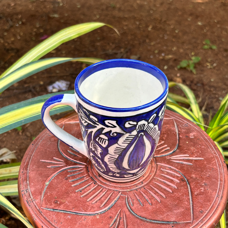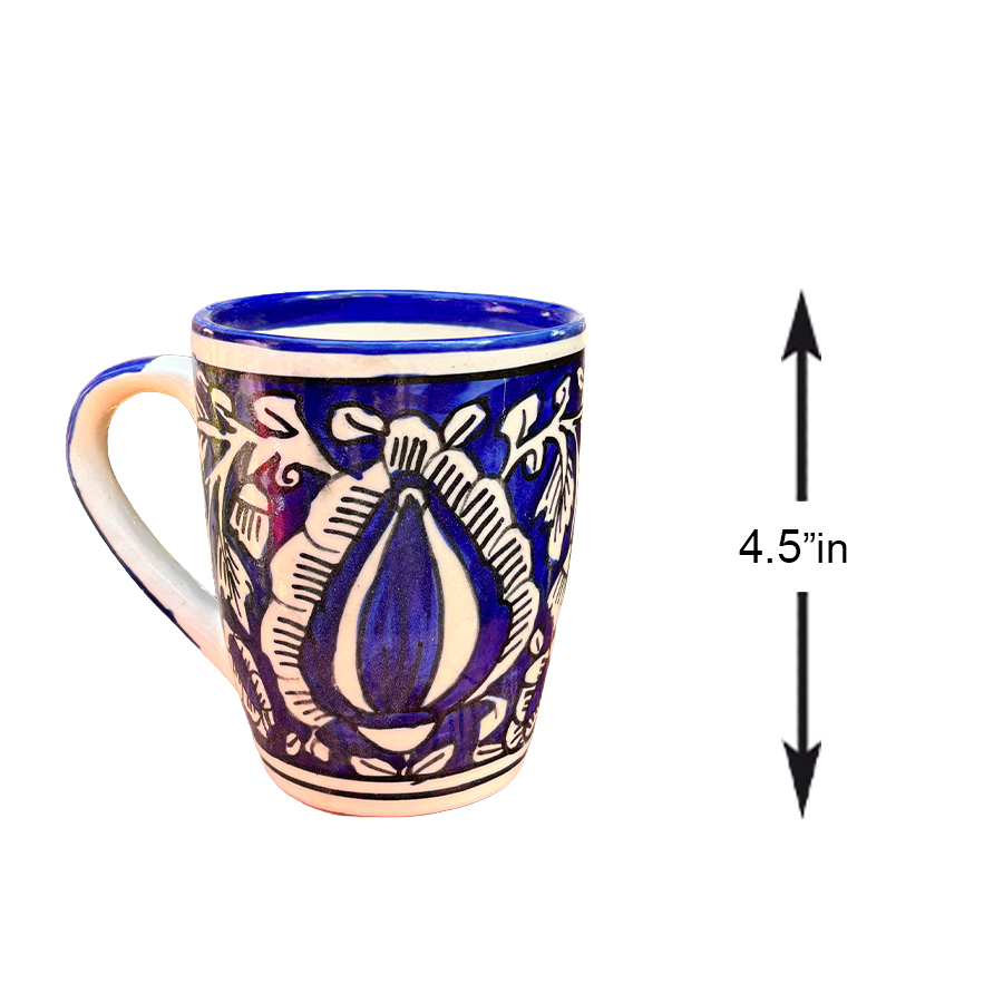 The rich cobalt blue background combined with detailed hand-painted motifs creates a striking and timeless look. Designed with a comfortable curved handle and a smooth glazed finish, this mug is ideal for enjoying tea, coffee, or other hot beverages while adding charm to your kitchen or dining setup.