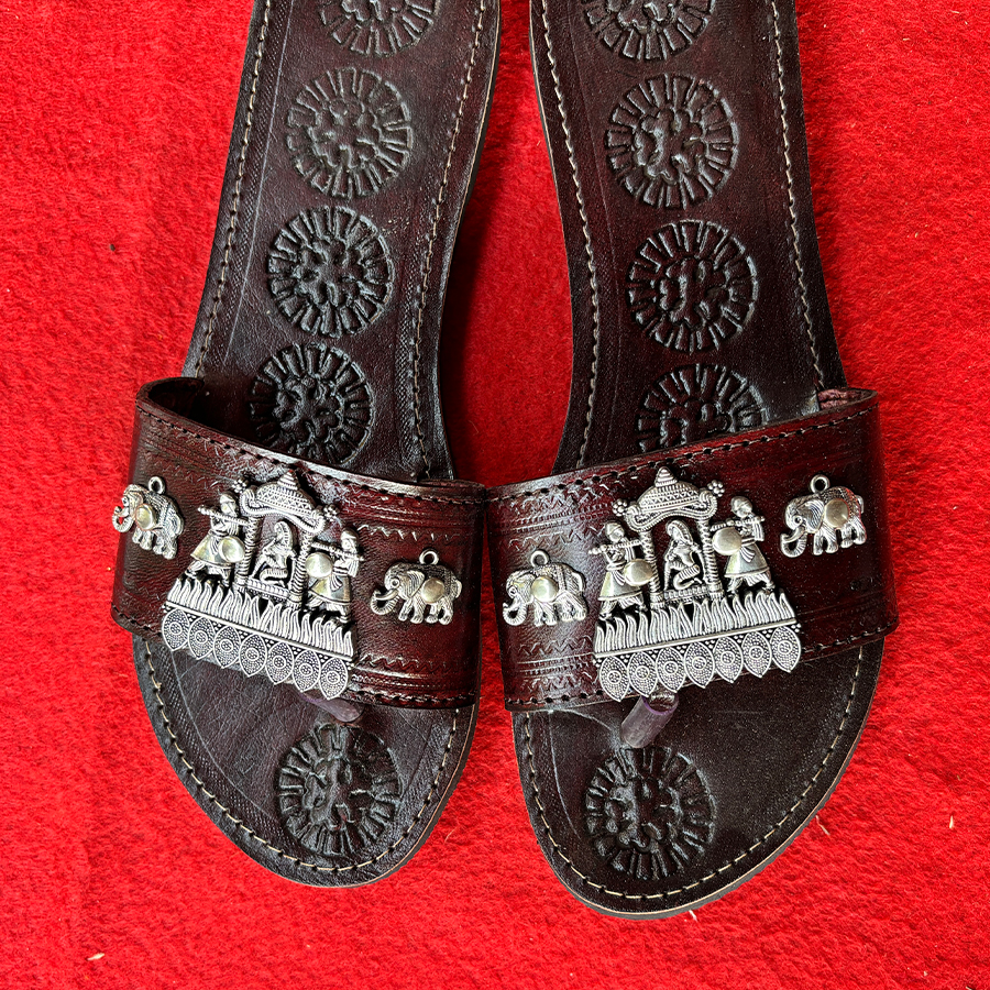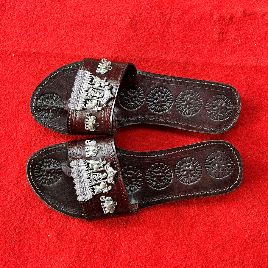 The upper strap is crafted from premium camel leather, hand-stitched and adorned with detailed silver-tone embellishments depicting elephants and folk-inspired figures—symbols of prosperity, strength, and cultural pride. The footbed is deeply embossed with circular traditional patterns, providing enhanced grip, breathability, and all-day comfort.