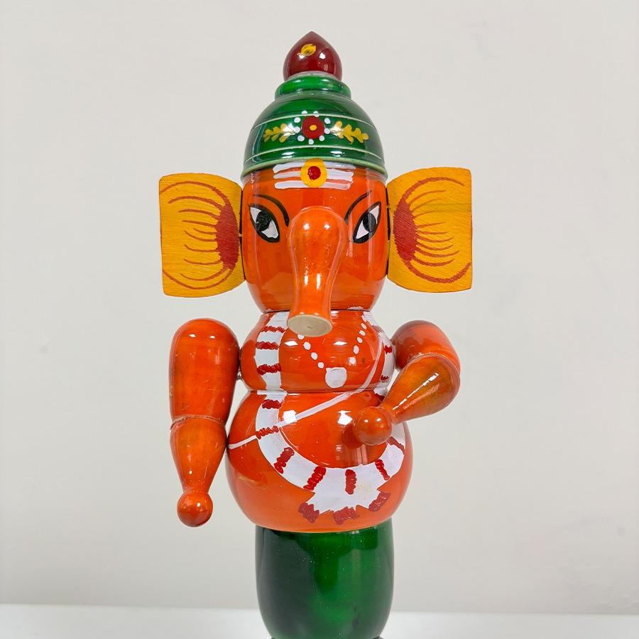 Invite positivity and divine blessings into your space with this Handcrafted Etikoppaka Wooden Standing (Roll) Ganesha Figurine. Designed in a traditional roll/standing form with a sturdy black base, this elegant Ganesha idol symbolizes wisdom, prosperity, and auspicious beginnings.