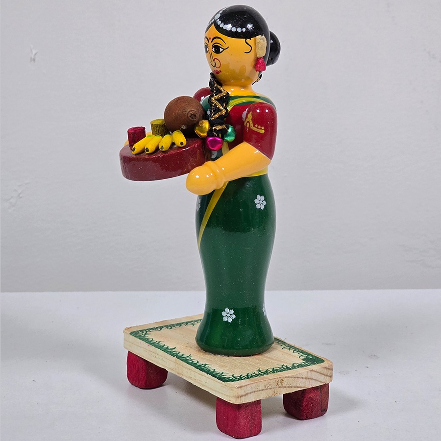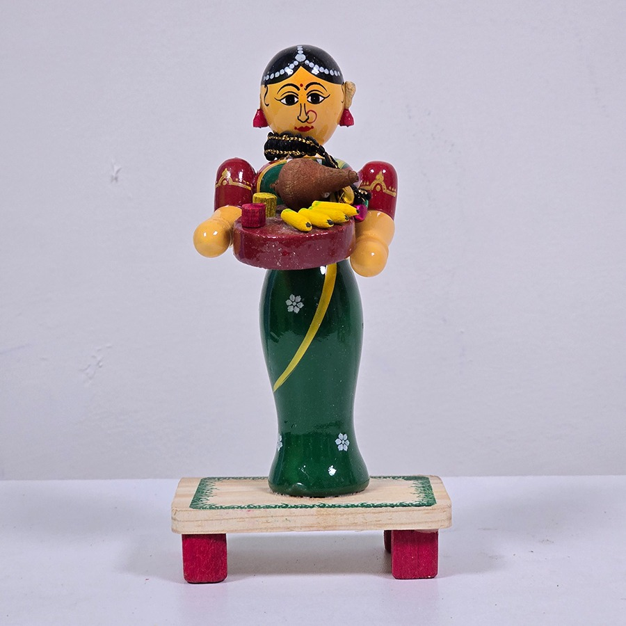 Welcome prosperity and tradition into your home with this Handcrafted Etikoppaka Wooden Welcome Lady Idol. Standing at 8 inches, this beautifully crafted figurine depicts a traditional lady holding a welcoming plate, symbolizing hospitality, abundance, and cultural warmth.