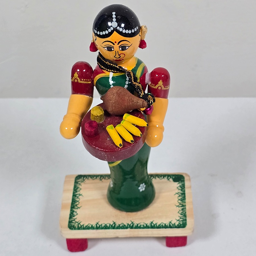 Made by skilled Etikoppaka artisans using the traditional lac-turning technique, this idol is carved from natural softwood and hand-painted with eco-friendly, non-toxic colors. The vibrant attire, delicate facial expressions, and fine detailing reflect authentic Indian folk artistry.