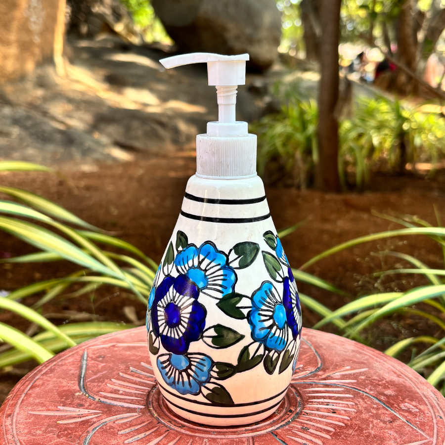 A handcrafted ceramic soap dispenser set with hand-painted floral designs. Durable, eco-friendly, and perfect for elevating bathroom or kitchen décor naturally.