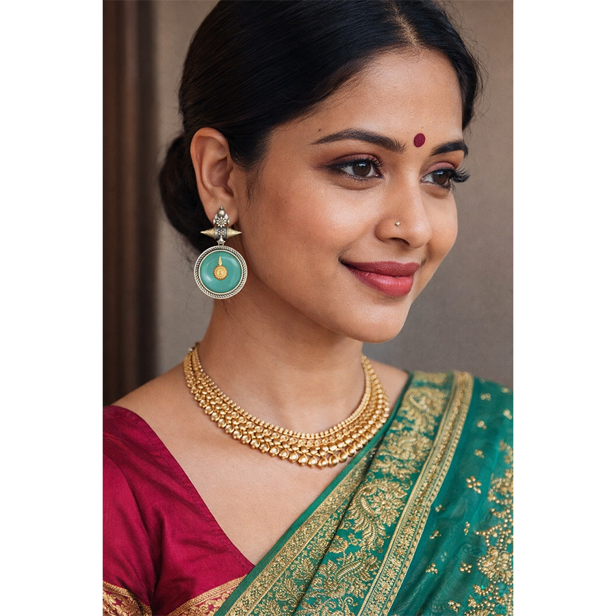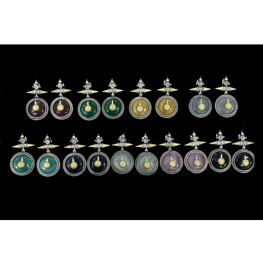The stones are elegantly framed in intricately detailed silver-toned settings, highlighted with ornate gold accents at the center and decorative caps at the top. The combination of textures, metallic tones, and vibrant gemstones creates a timeless, artisan aesthetic suitable for both traditional and contemporary styling.