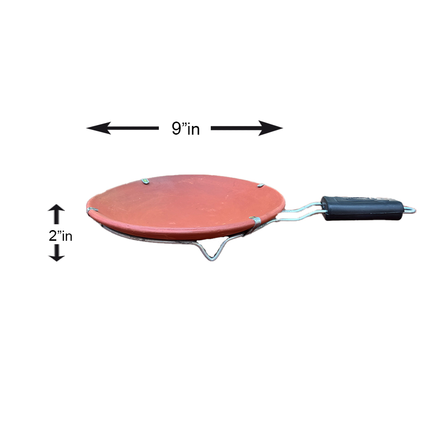 This handcrafted terracotta pan with steel lid is made from high-quality natural clay using traditional pottery methods. With a 9-inch diameter and 2-inch height, it is perfectly suited for preparing curries, vegetables, dals, roasts, and traditional recipes.