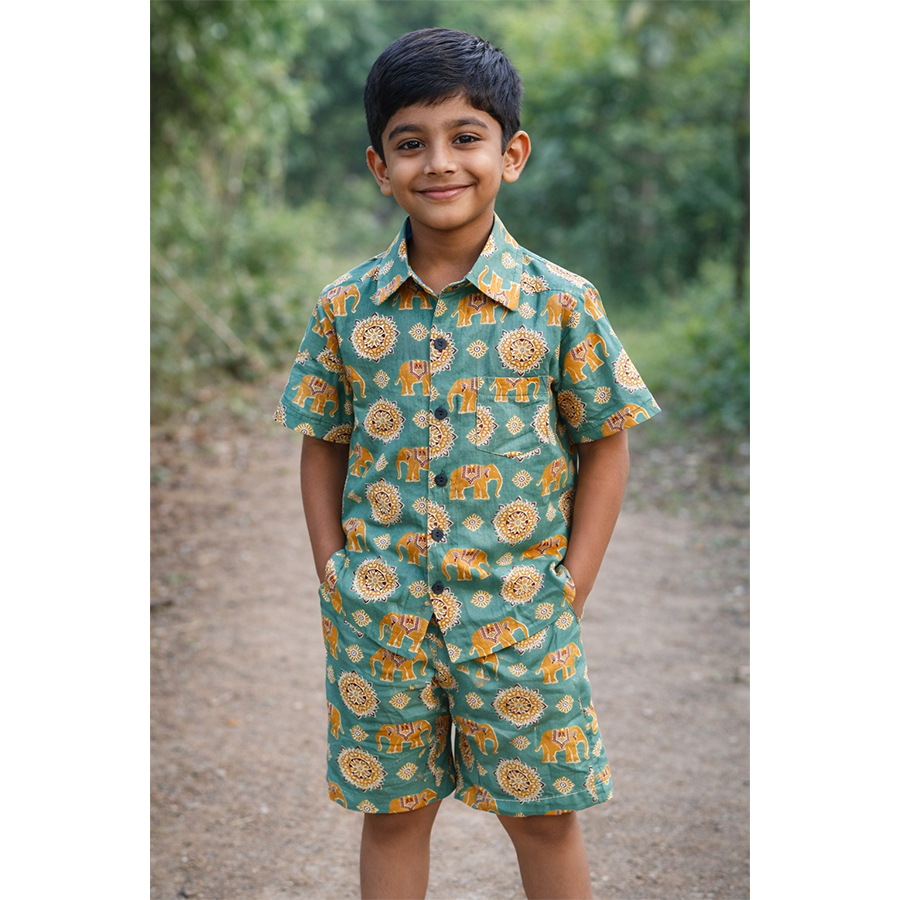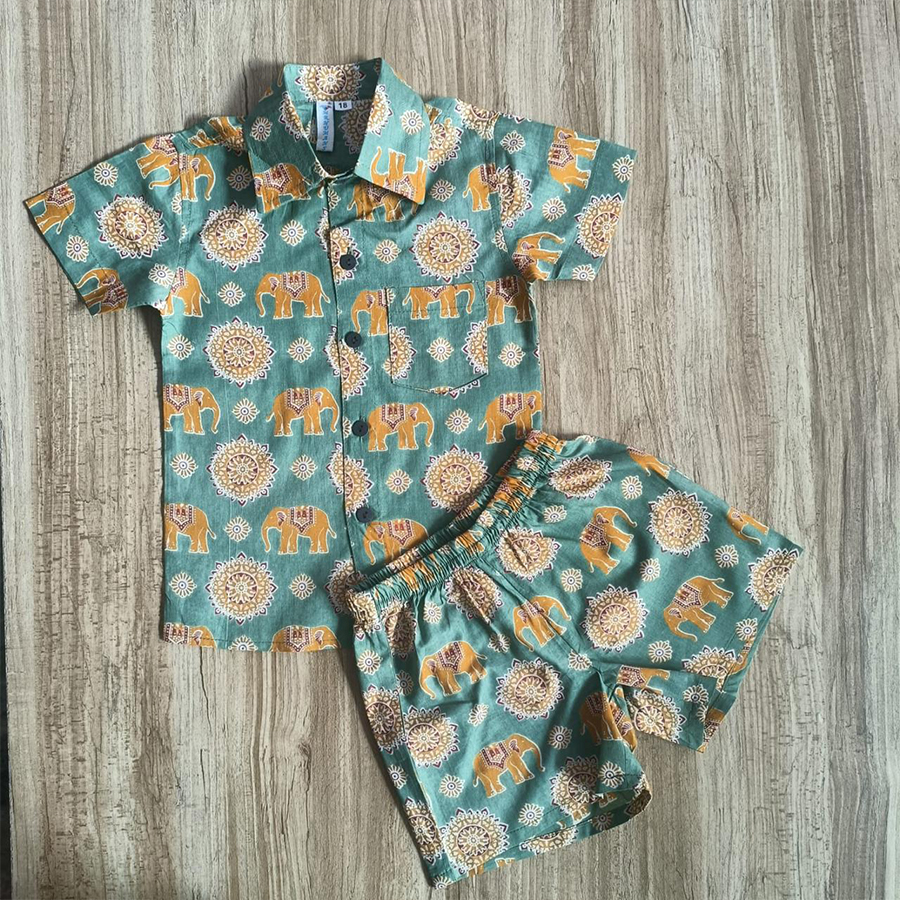 Upgrade your little one’s wardrobe with this adorable kids cotton co-ord set. Crafted from premium hand block printed fabric, this outfit features a beautiful elephant motif that gives it a unique ethnic and playful touch. The soft cotton material ensures breathability and comfort, making it perfect for everyday wear, outings, or casual occasions.