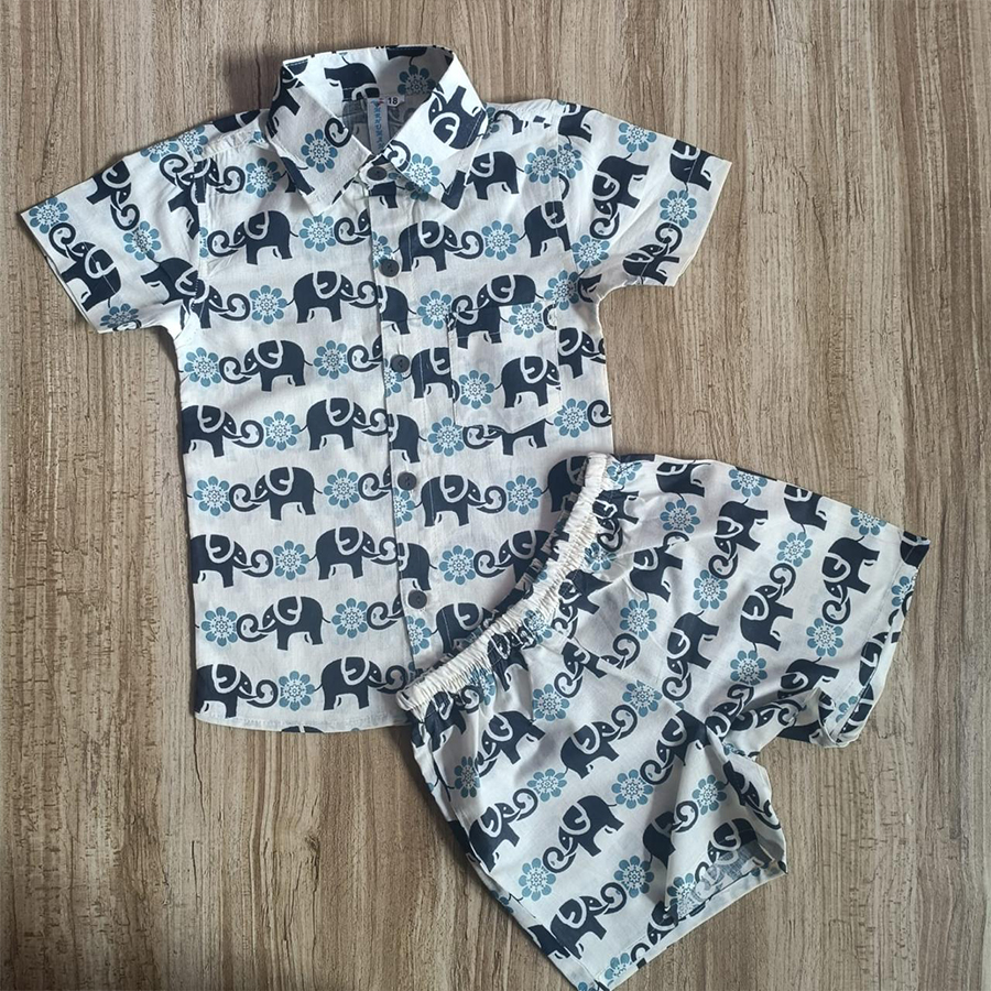 The set includes a half-sleeve button-down shirt with a pocket and matching elastic waist shorts, making it both trendy and comfortable. The cute elephant and floral print design adds a playful and charming look that kids will love.