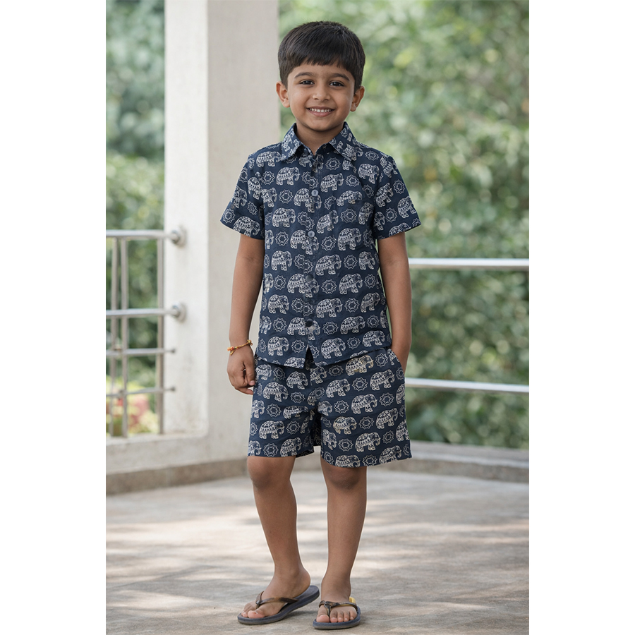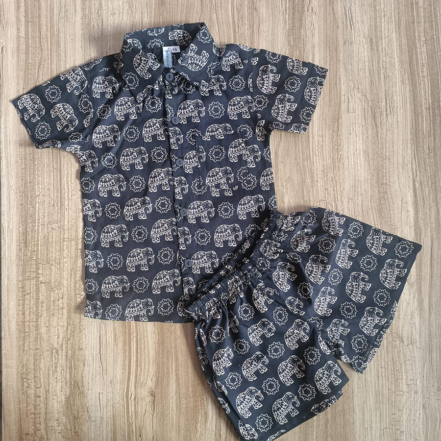 Cute kids co-ord set made with soft hand block printed cotton fabric featuring adorable elephant prints. Includes a half-sleeve shirt with pocket and matching shorts for a stylish and comfortable look.