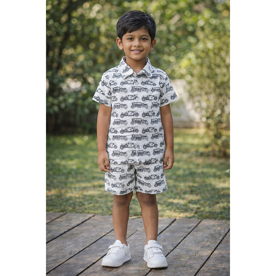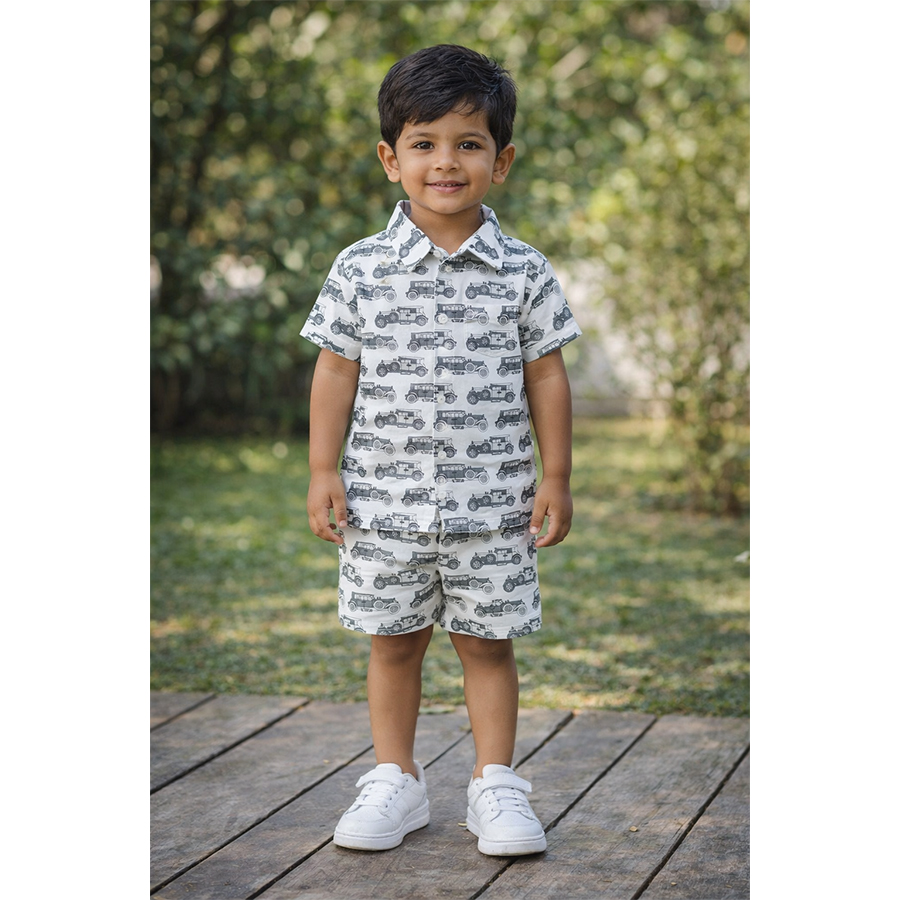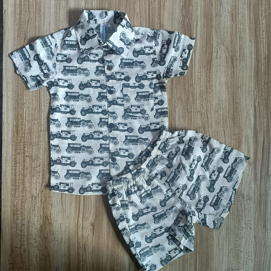 The set includes a half-sleeve button-down shirt with a stylish pocket and matching elastic waist shorts, offering both comfort and ease of movement. The colorful elephant hand block print design adds a fun and vibrant touch that kids will love.