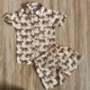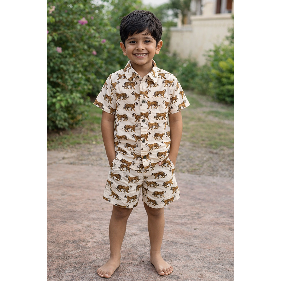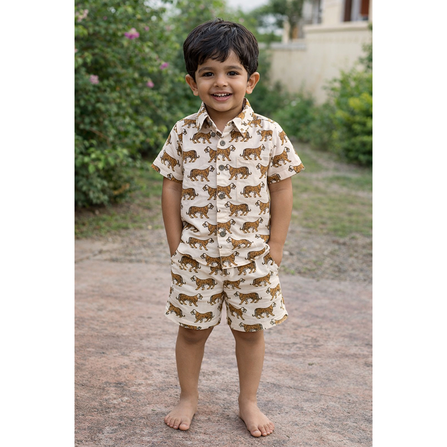 The set includes a half-sleeve button-down shirt with a front pocket and matching elastic waist shorts, creating a perfectly coordinated outfit. The playful tiger print design adds a bold and cute touch that kids will love.