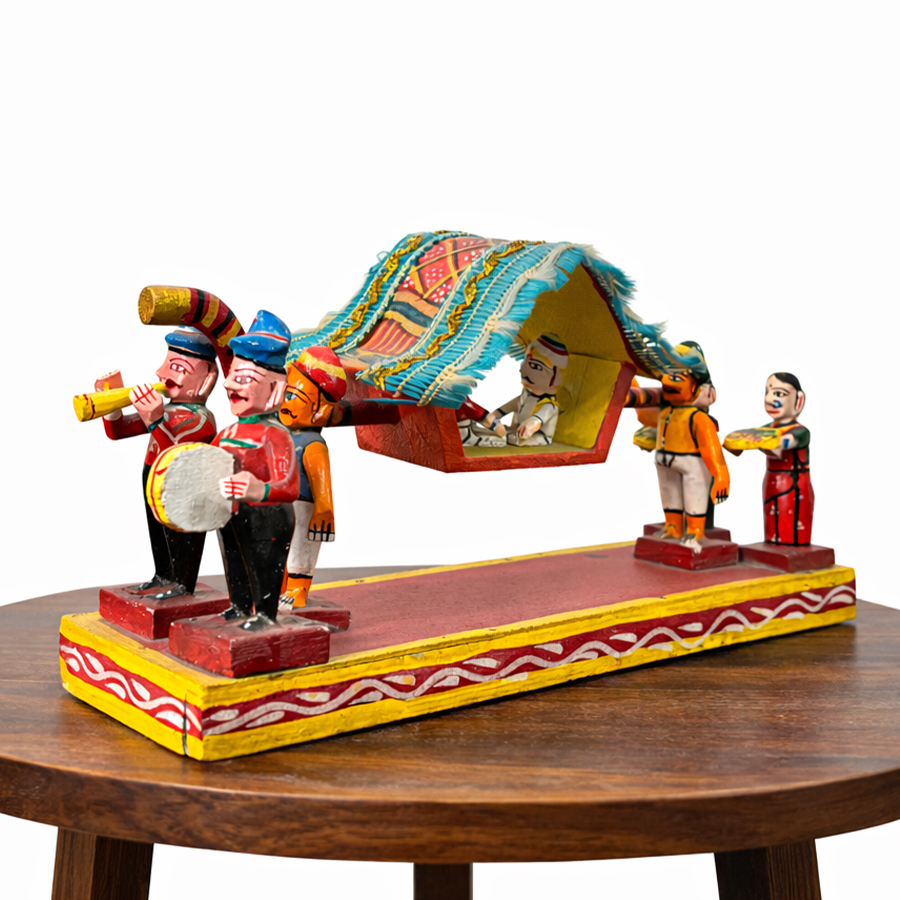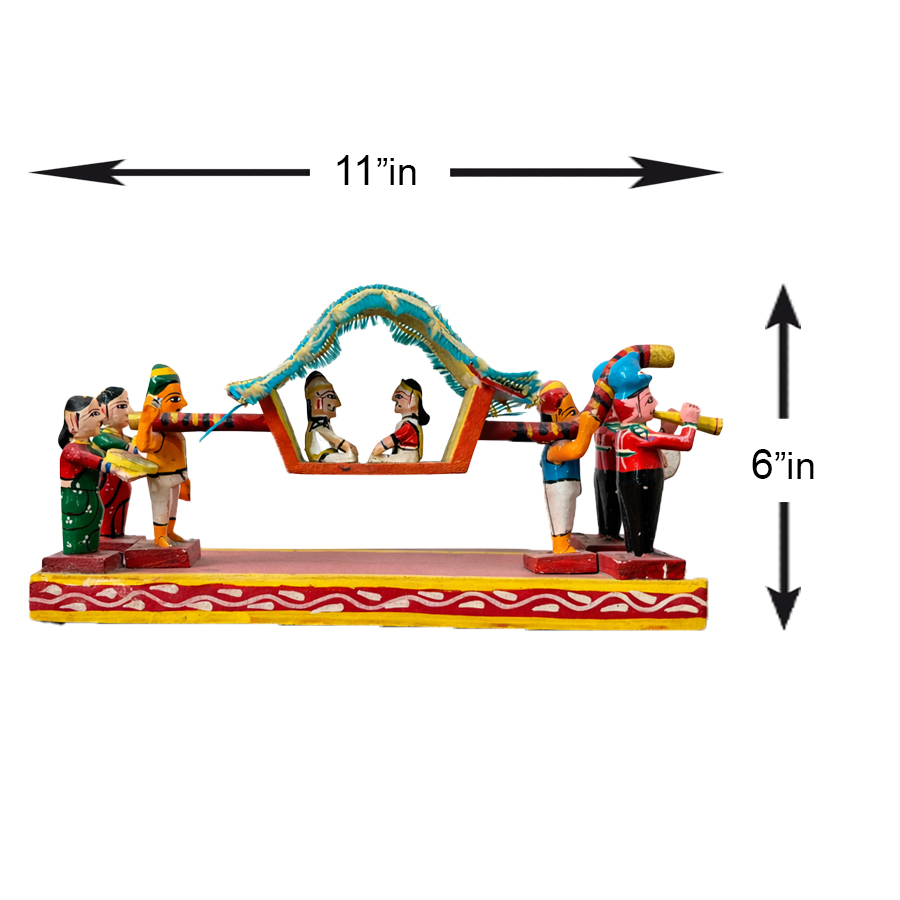 Celebrate the grandeur of traditional Indian weddings with this beautifully handcrafted Kondapalli Wedding Palanquin wooden showpiece. Measuring approximately 6 inches in height with an 11 x 3 inch base, this compact yet detailed figurine is a stunning representation of a classic bridal procession.