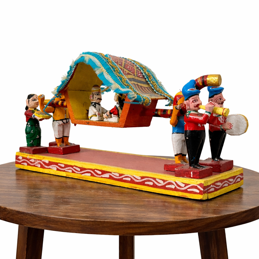 Expertly carved from lightweight softwood by skilled artisans of Kondapalli, Andhra Pradesh, the piece showcases a bride and groom seated inside a decorative palanquin (palki) with a charming fabric canopy overhead. The palanquin is carried by attendants on both sides, each figure intricately hand-painted in vibrant shades of red, green, yellow, blue, and black, reflecting authentic folk artistry.