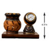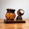 The pen stand features a beautifully carved pot-shaped holder adorned with intricate leaf patterns and rustic detailing, reflecting the signature artistry of Kondapalli craftsmanship. The natural wood tones combined with darker accents give it a rich, classic appearance. Attached to the base is a mini round table clock with a clear dial and easy-to-read numerals, adding both convenience and decorative charm.