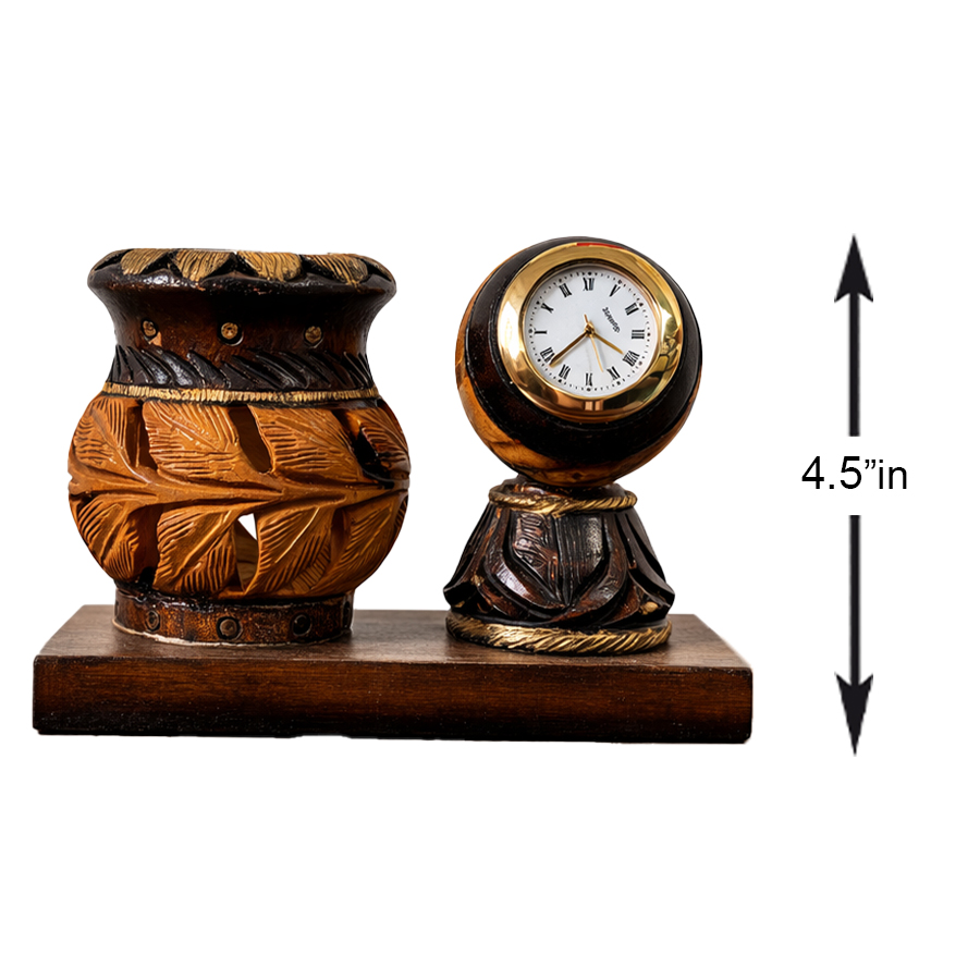 Crafted from quality wood and finished with a smooth polish, this piece is sturdy, durable, and lightweight. The pen holder provides ample space for storing pens, pencils, or small stationery items, while the clock keeps time within easy view.