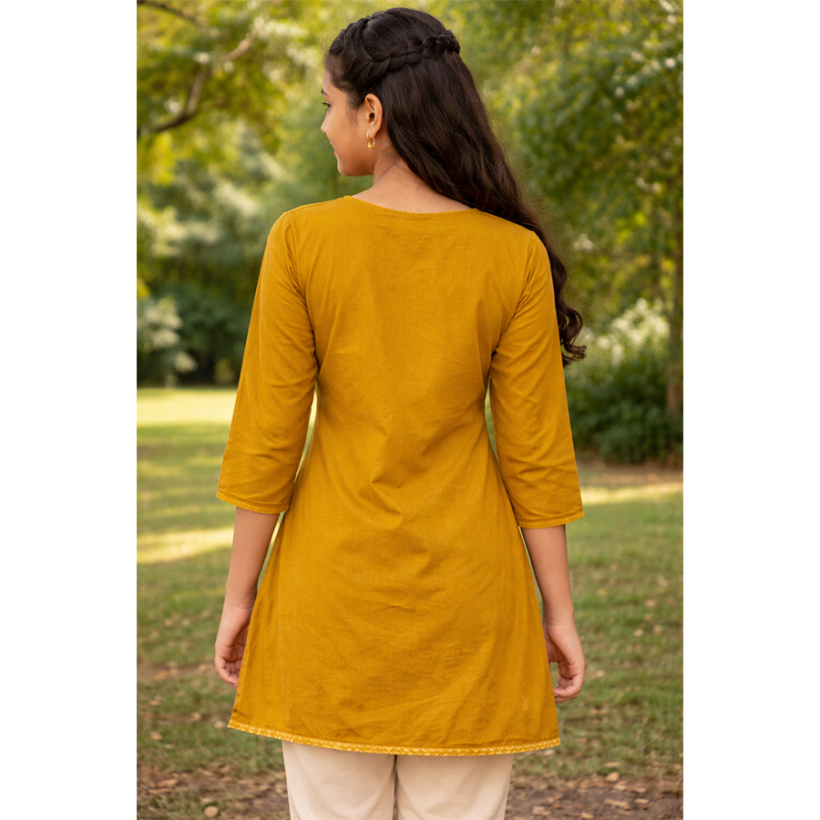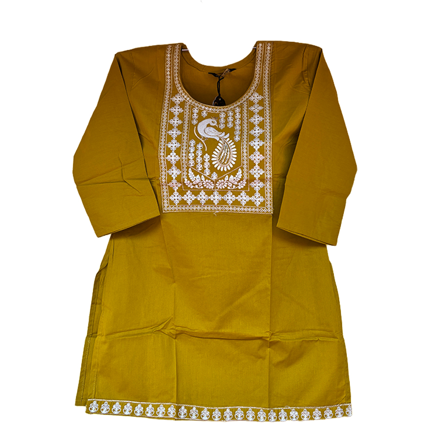 This Mustard Yellow Cotton Slub Kurti is a timeless wardrobe essential for women who appreciate understated elegance, traditional motifs, and all-day comfort.