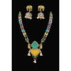 At the center lies a striking geometric pendant highlighted by a large teardrop-shaped aqua stone paired with a bold triangular golden stone. Intricate elephant motifs on either side add a symbolic touch of strength, wisdom, and prosperity. The pendant is further enhanced with delicate pearl drop accents and additional colored stones that create graceful movement and festive charm.