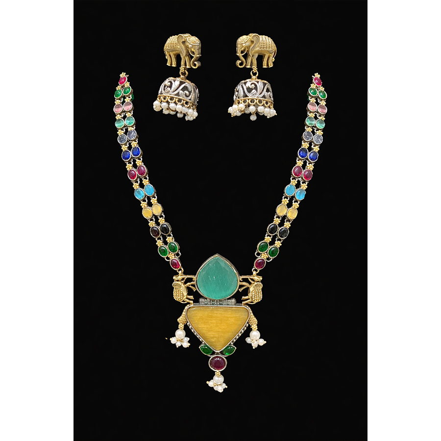 Make a majestic statement with this exquisite dual-tone long necklace set, designed to reflect heritage craftsmanship and royal elegance. The necklace features a beautifully detailed chain adorned with vibrant multicolored stones inspired by the traditional Navratna style, creating a rich and eye-catching spectrum of hues.