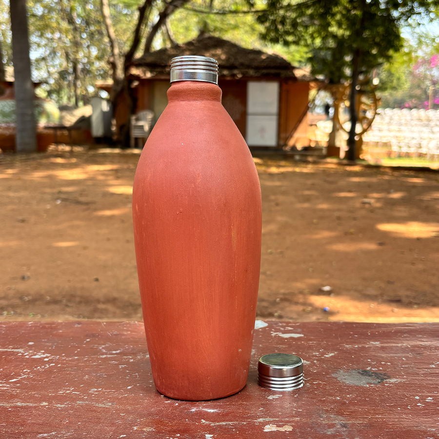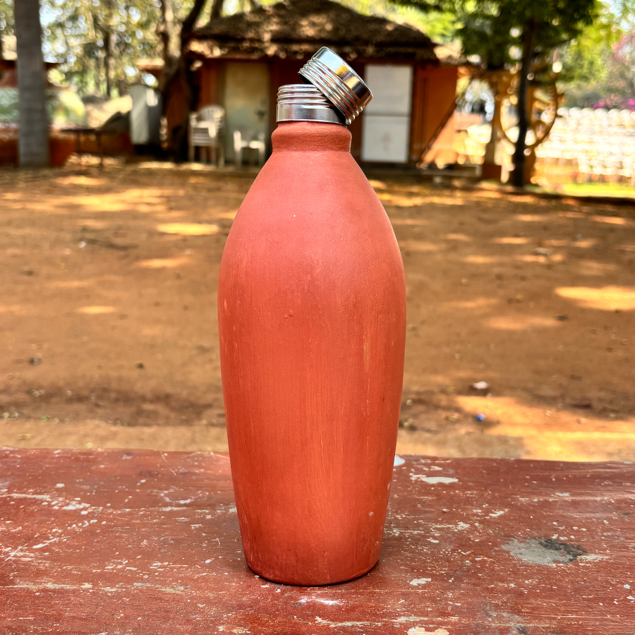 Traditional 11-inch earthen water bottle with a secure steel cap—naturally cools water and adds an authentic rustic touch.