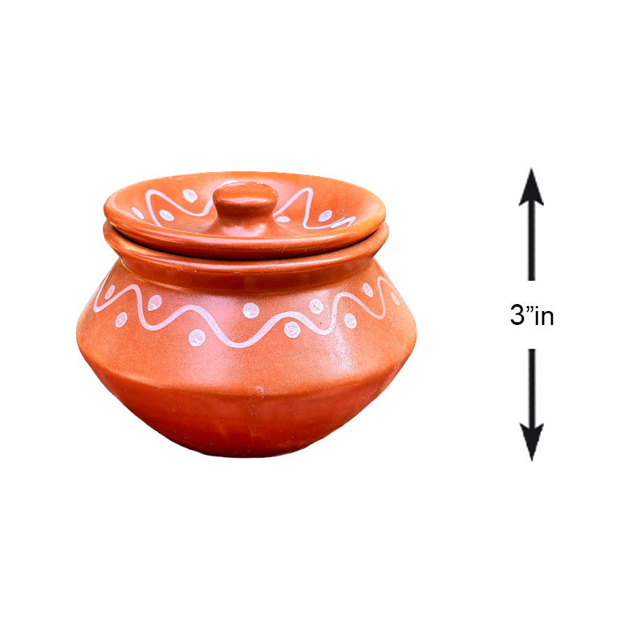 Add rustic charm to your kitchen or décor collection with this beautifully handcrafted terracotta storage pot. Standing 3 inches tall, this compact clay jar comes with a matching lid and features a traditional white hand-painted wave and dot pattern that enhances its cultural appeal.