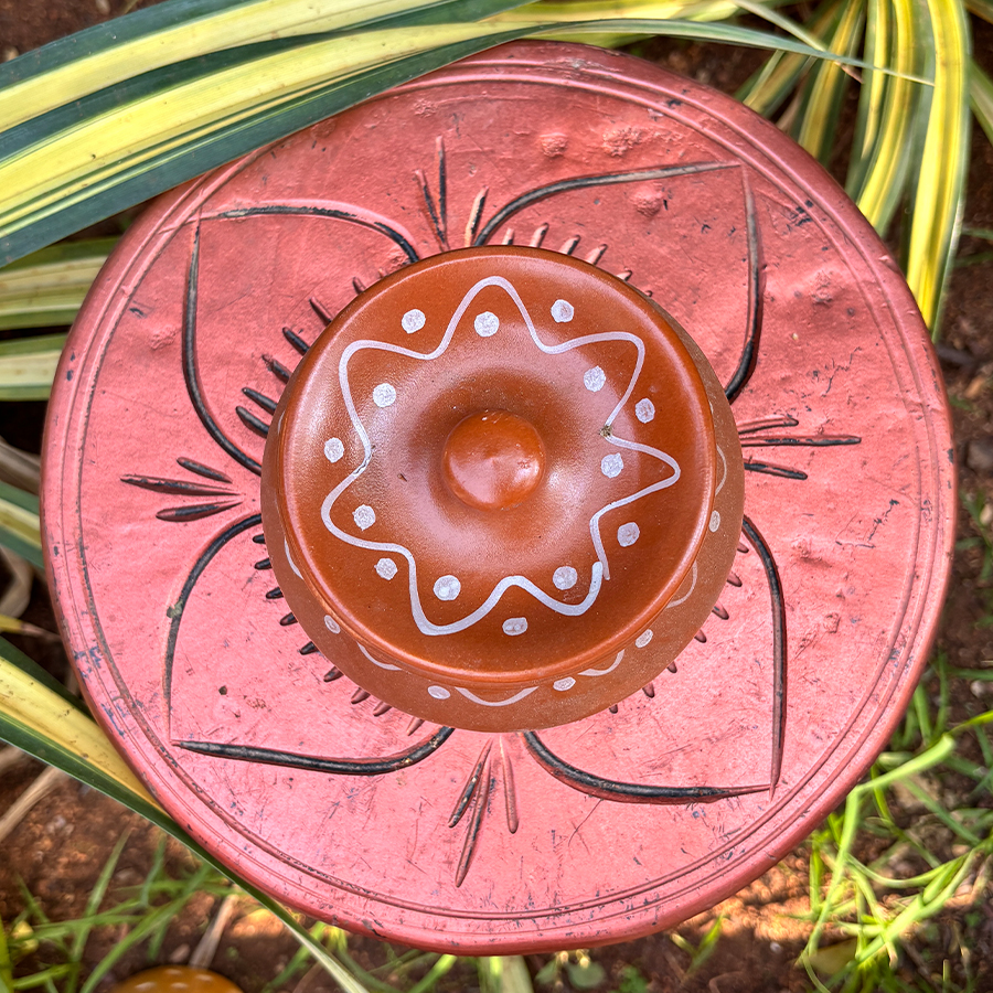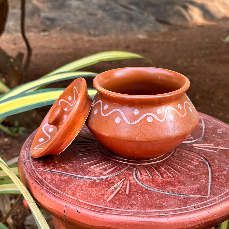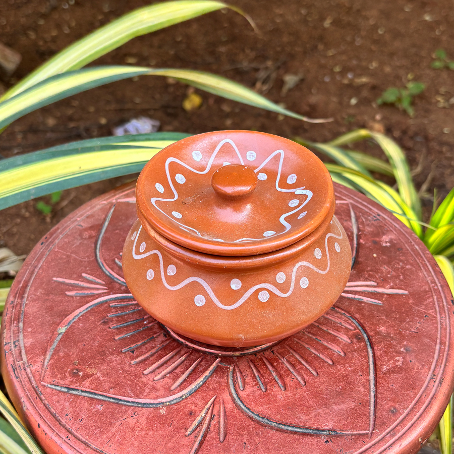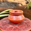 Made from natural terracotta clay, this pot offers an earthy tone and matte finish that reflect authentic artisanal craftsmanship. The snug-fitting lid helps keep contents covered, making it ideal for storing spices, salt, mouth fresheners, dry fruits, or small household items.