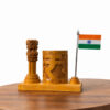 The pen stand features three distinct elements mounted on a sturdy wooden base. On one side stands a finely carved Ashoka Pillar replica, symbolizing India’s rich history and national identity. At the center is a cylindrical pen holder adorned with an intricately engraved Indian Rupee (₹) symbol and decorative patterns, providing ample space to store pens, pencils, or markers. Completing the design is a miniature Indian national flag mounted on a sleek pole, adding a vibrant tricolor accent.