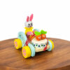 The toy features a cheerful bunny seated in a pastel-colored cart with bright yellow wheels and decorative floral accents. At the front, two cute carrot figures with smiling faces add a playful touch, while the red pull string makes it easy for children to drag the cart smoothly across the floor. The soft pastel tones paired with lively orange, pink, and green details create an eye-catching and joyful design.